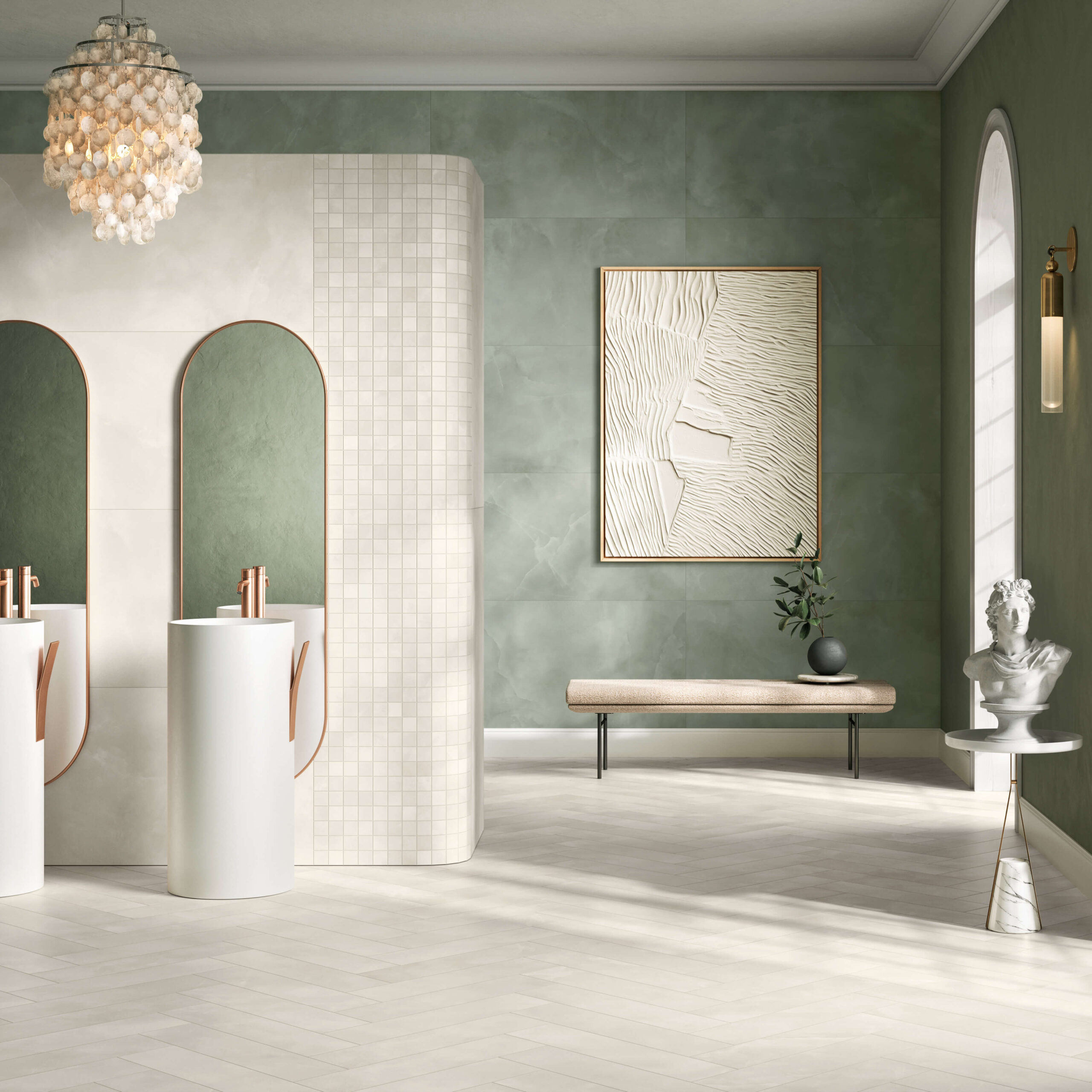Inspired by the swirling beauty of deep space, Celestra brings a cosmic elegance to walls and floors. Cloud-like patterns and soft, celestial tones create a sense of movement and depth, while its 12″x24″ tiles and 1″x3″ herringbone mosaics offer versatile design options. Durable and striking, Celestra adds a modern, atmospheric touch to any interior.