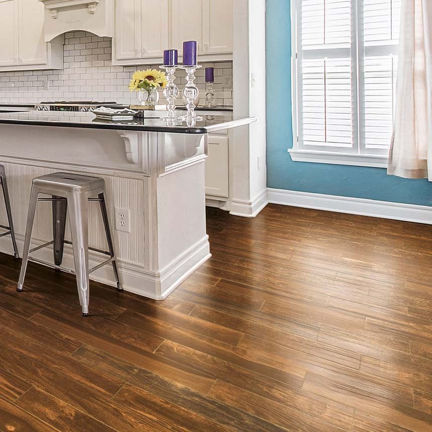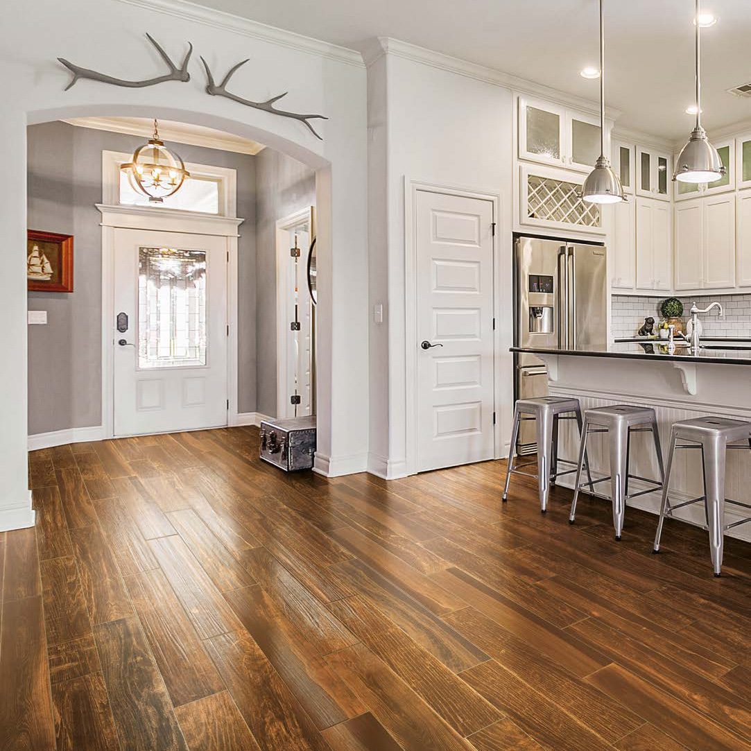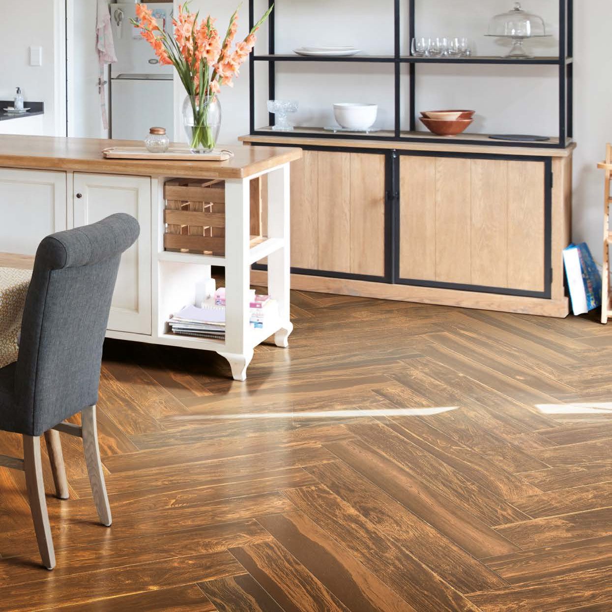A glossy wood look porcelain tile complements the woods character and natural structure. Making a statement of elegance and subtle sophistication.