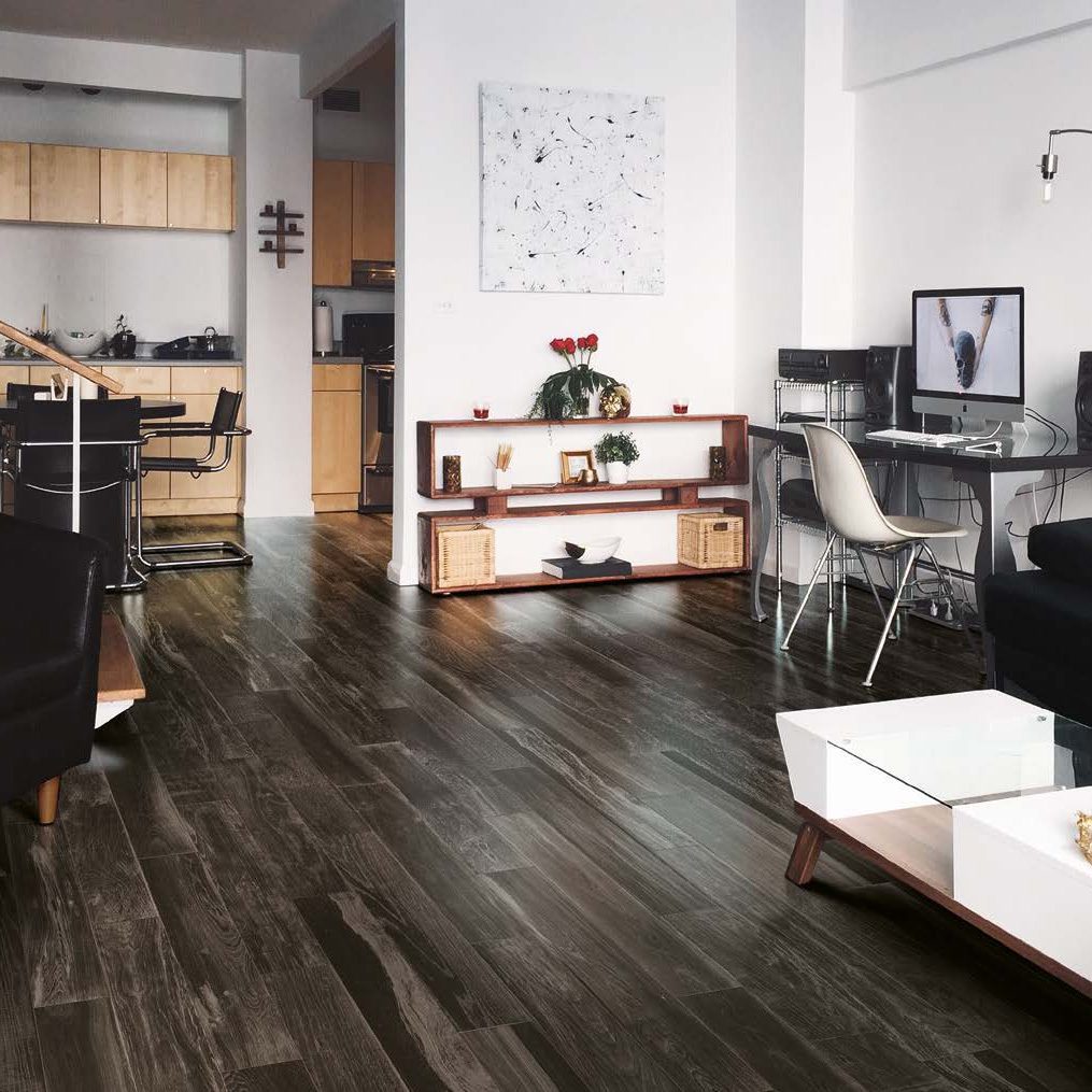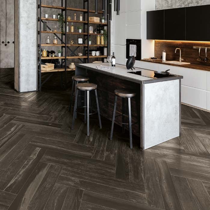 A glossy wood look porcelain tile complements the woods character and natural structure. Making a statement of elegance and subtle sophistication.