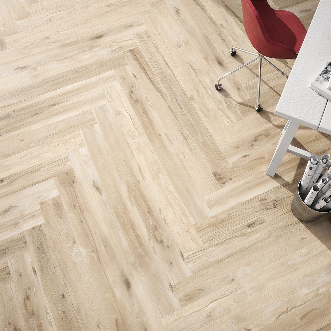 Wood looking porcelain tile in a variety of colors, with high variation, and pressed edges.